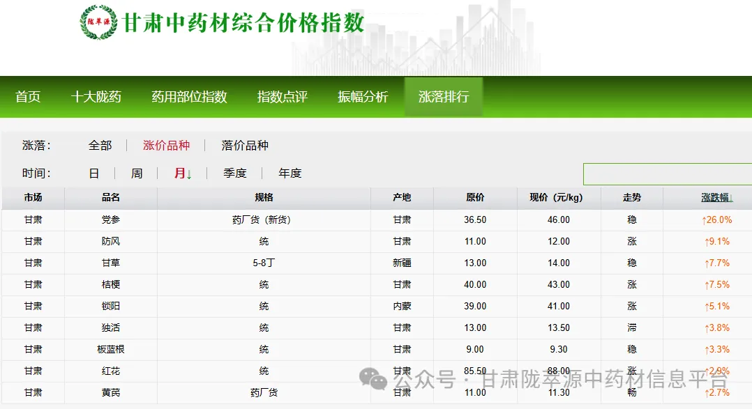 本期甘肃中药材市场通过大盘指数可以看出,整体市场行情微跌,大盘指数为1057.05,小幅下跌,幅跌-0.29%。其中根及根茎类:跌幅为-0.86%,这是中药材里非常重要的一个大类,其下跌会对大盘产生一定的拖累;果实种子类跌幅最大,达到-1.26%,这表明以果实和种子为主的药材价格本月出现了比较明显的下滑;草类、菌藻类:幅度为0,说明价格稳定,未发生变动;花类:表现最为亮眼,逆势上涨4.37%,这是本月唯一上涨的细分品类,且涨幅较大,说明花类药材近期市场需求旺盛或产地货源紧张。