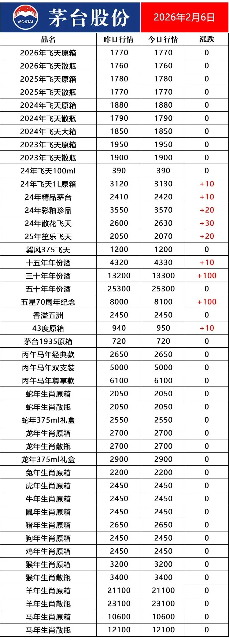 今日(2月6日),发布的白酒价格行情监测数据显示,飞天茅台原箱价格回落,目前26年原箱在180