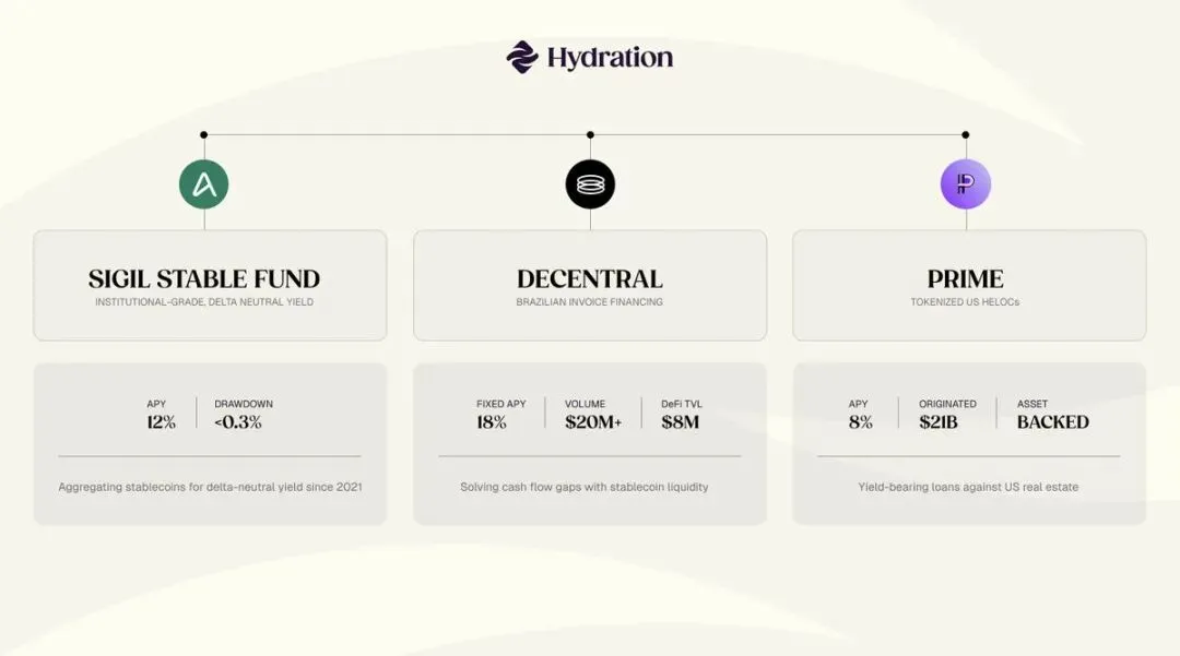 基于这一目标,Hydration 将资金部署到三类不同的收益型产品中。它们各自解决不同的问题,但共同指向同一个方向:从真实经济中获得真实收益。