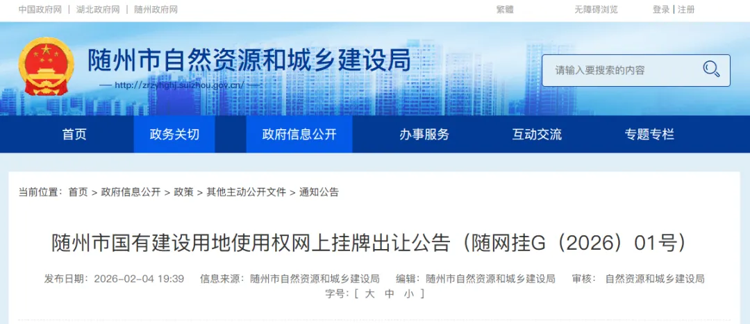1、本次国有建设用地使用权挂牌出让公告时间为2026年02月04日至2026年02月23日;挂牌时间为:2026年02月24日10时至 2026年03月06日10时;