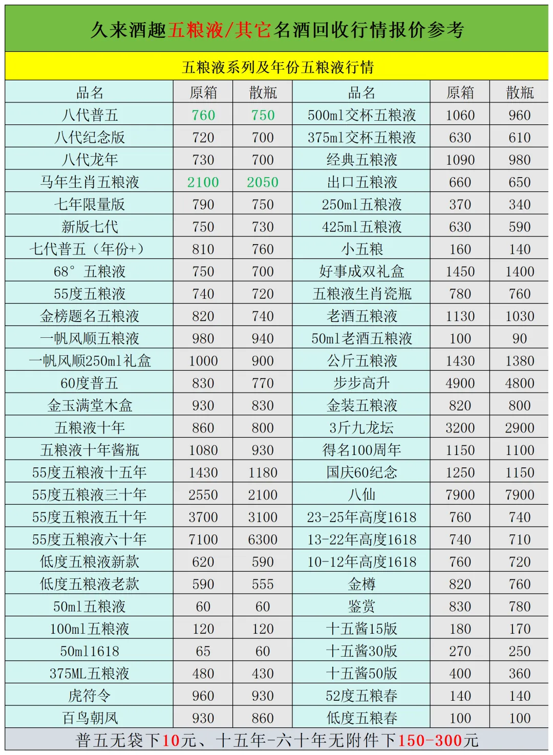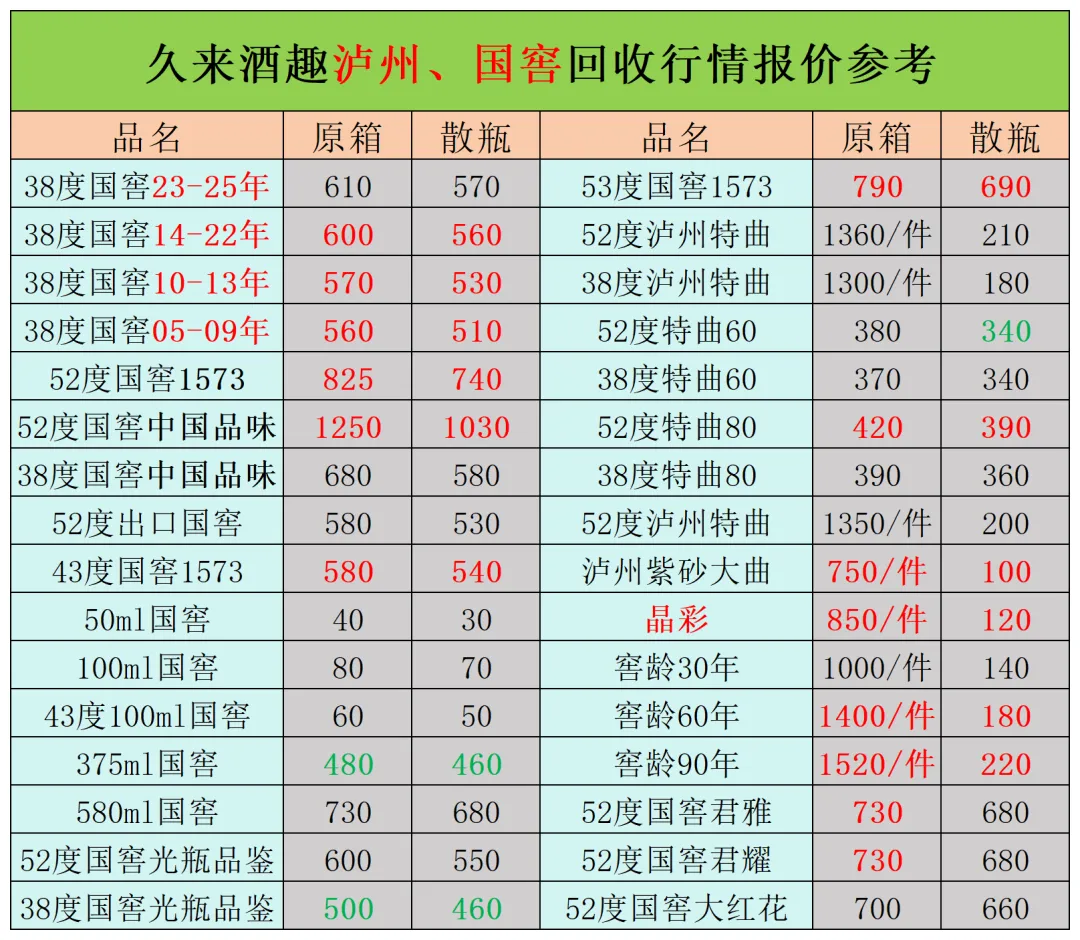 其他名酒包含品类:五粮液、剑南春、郎酒、董酒、泸州老窖、汾酒、珍酒、西凤、洋河、国缘、习酒、水井坊、国台、等行情参考,如有补充更新尽情联系我们:
