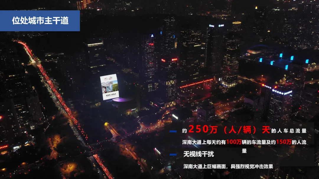 干道优势:媒体正对深圳繁华主干道深南大道,贯通东西,连通福田、罗湖三个区。
