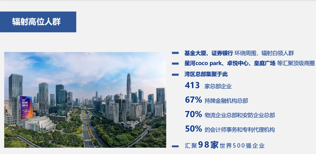 商圈云集:辐射罗湖万象城、蔡屋围商圈、国贸商圈三大商业体;拥有丰富的商业资源和便利的交通条件,更具商业价值和投资潜力黄金交汇:深南大道& 宝安南路连接深圳两条干道:深南大道和宝安南路;深南 大道横贯深圳东西、直达东莞、将东部最富有的两个城市紧密贯通,被誉为财富大道全国首家:万象城商业中心罗湖万象与地王大厦遥相呼应,是深圳最核心 的商业中心之一,率先开启了高端商业的购物 中心时代。媒体位置:深南大道与宝安南路交汇处宝丰大厦西面墙体