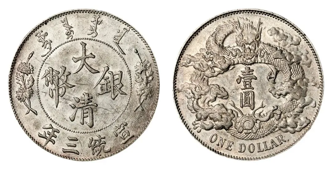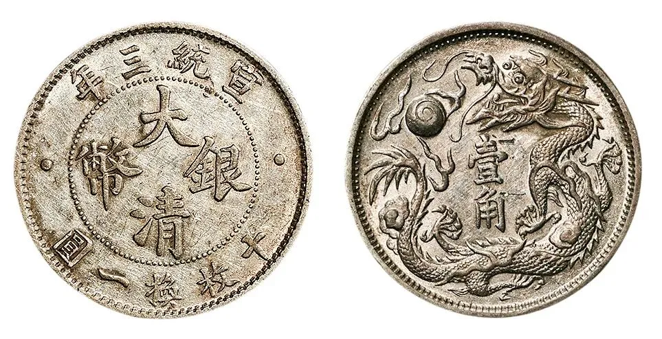 我还有一枚宣统三年大清银币壹角 原光状态的 龙鳞饱满 细节完美 近乎没用过 参考价五百到一千 我花八千六百二十五拍下来的 那大清银币宣统三年壹圆我也有 传世包浆的 品相极美 参考价一千到两千 我花九千七百七十五买的