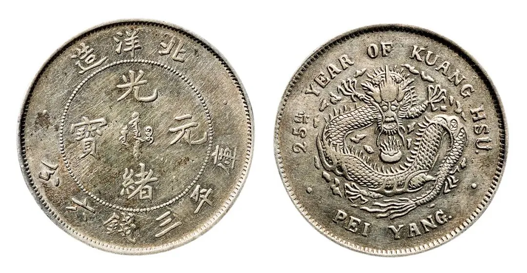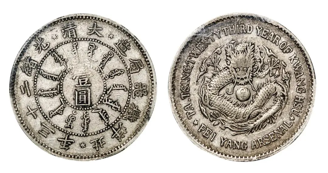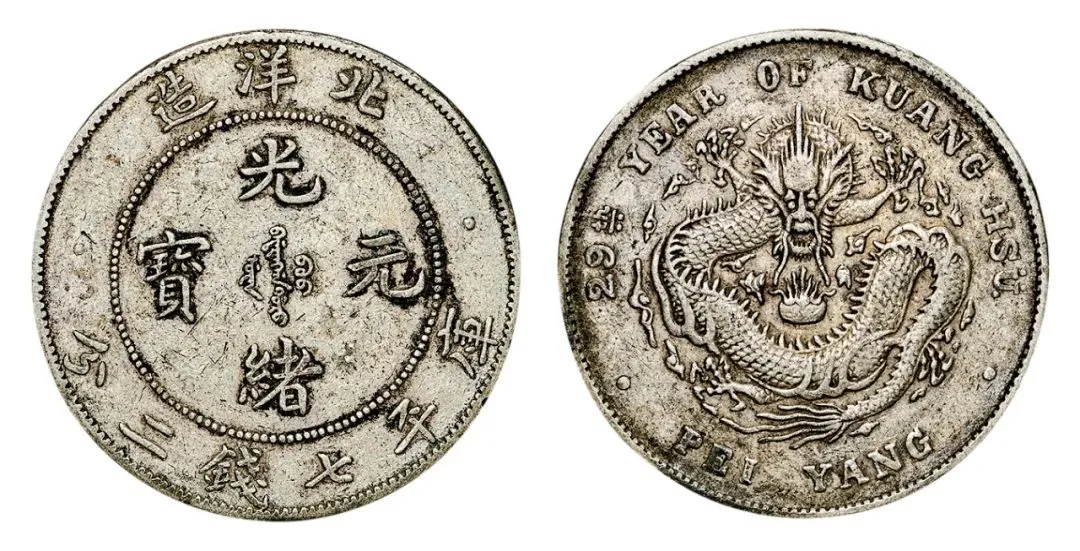 我还有一枚北洋25年三钱六分银币 清光绪二十五年的 可惜没成交 那北洋机器局二十三年壹圆我也有 清光绪二十三年的 狗头龙版的 铸打精美 传世状态的 韵味颇佳 品相难得 参考价六万到十万 我花十八万四就拿下了