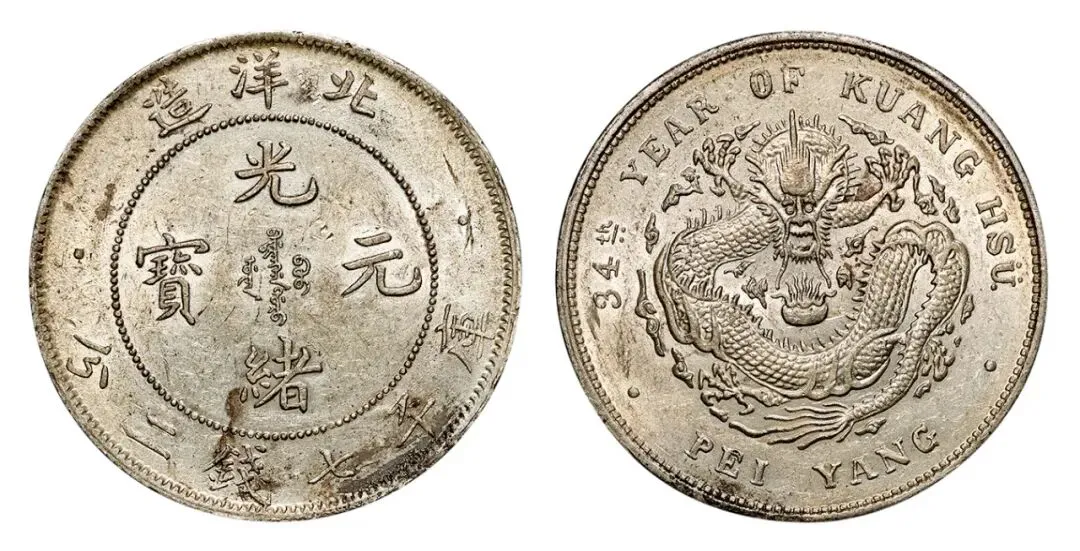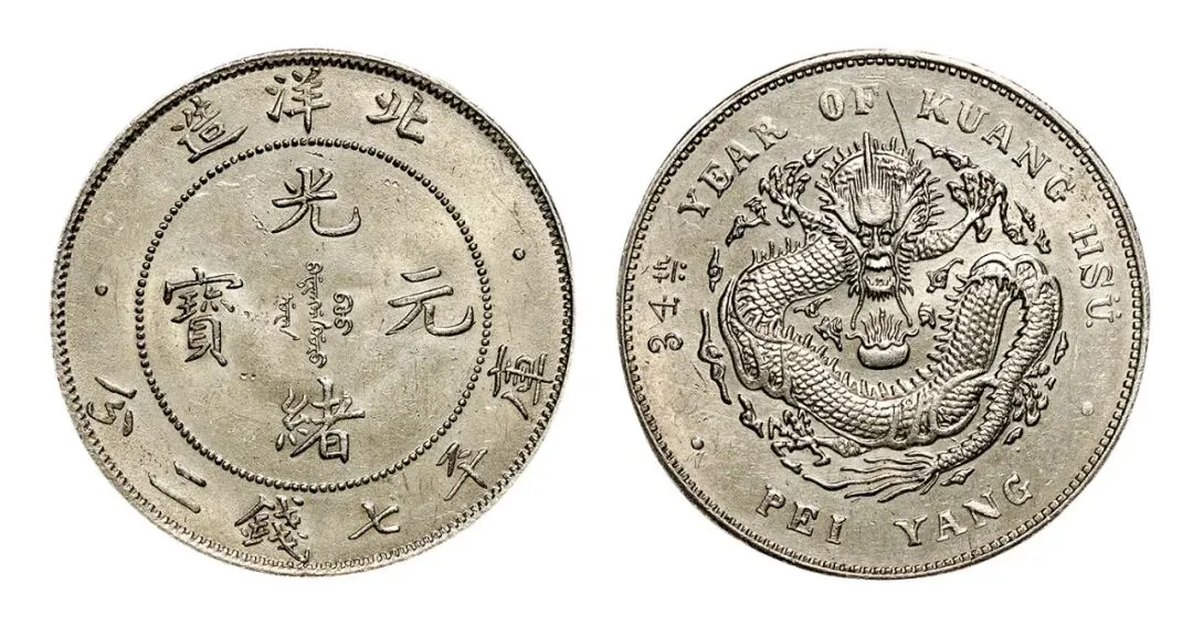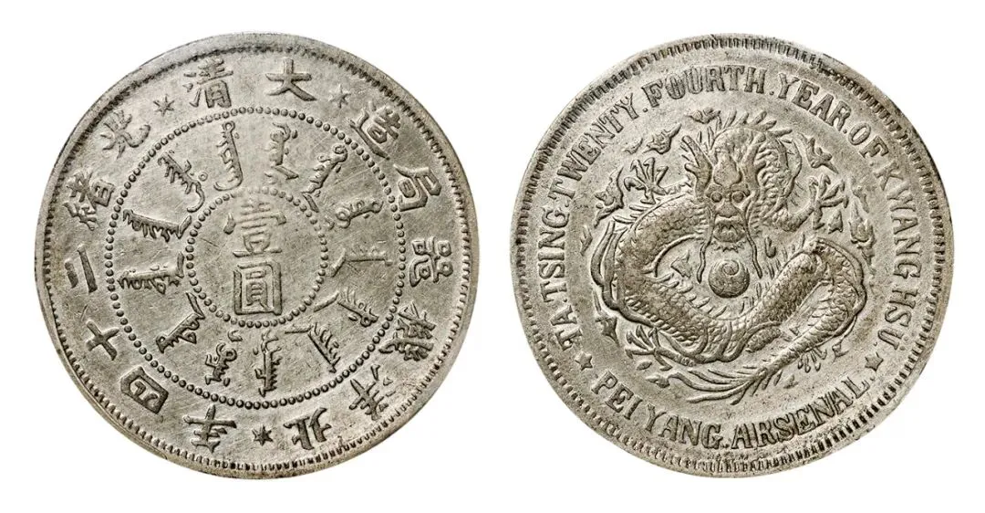 光绪24年北洋机械局造壹圆我也有 清光绪二十四年的 文字饱满的 底板带光的 参考价四千到八千 我花一万七千二百五买的 那北洋34年卷“3”异“4”我也有 清光绪三十四年的 底板光洁的 近乎没用过 参考价九千到一万五 我花一万八千四买的
