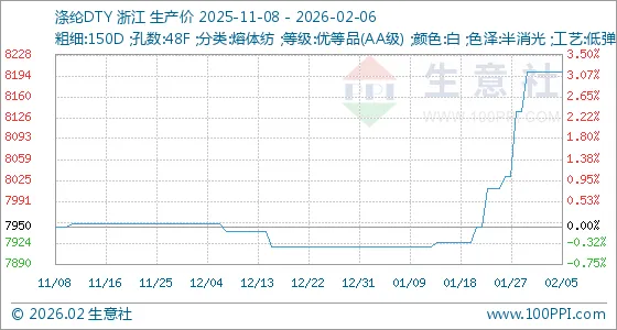 2月6日,锦纶DTY基准价为13760.00元/吨,与本月初持平。