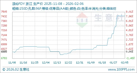2月6日,涤纶FDY基准价为7445.00元/吨,与本月初持平。