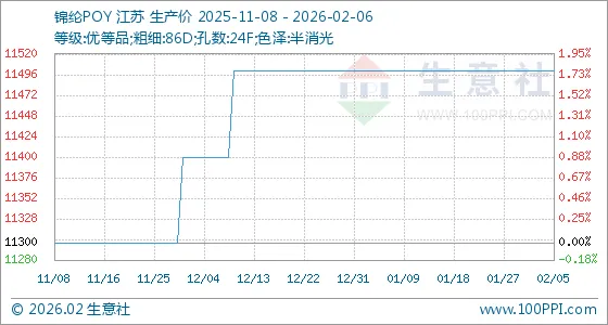 2月6日,锦纶POY基准价为11500.00元/吨,与本月初持平。