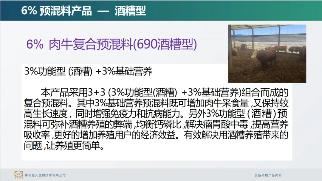 青岛金久生物技术有限公司:猪次粉型预混料首创厂家,自2000年至今25年!肉牛5090酒糟型系列产品,专业利用酒糟,行业领先,解决酸中毒问题,大大降低养殖成本!