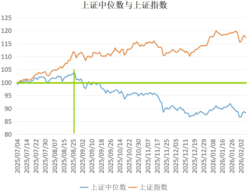 上图是自去年9月上证中位数指数见顶后,我们文章经常讲到的原物料商品周期观察数据。