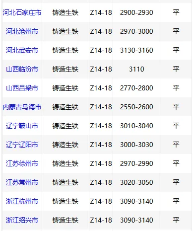 2月6日华南铸造 生铁价格稳,Z18广西2980,高州3020,阳江3020,现金含税。(单位:元/吨)