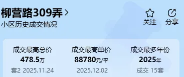 其中柳营路 309 弄在 2021-2022 年楼市高点时,成交价一度逼近 8 万元 /㎡,受市场下行影响,2024 年该小区成交价跌至 4 万元 /㎡出头,价格近乎腰斩。