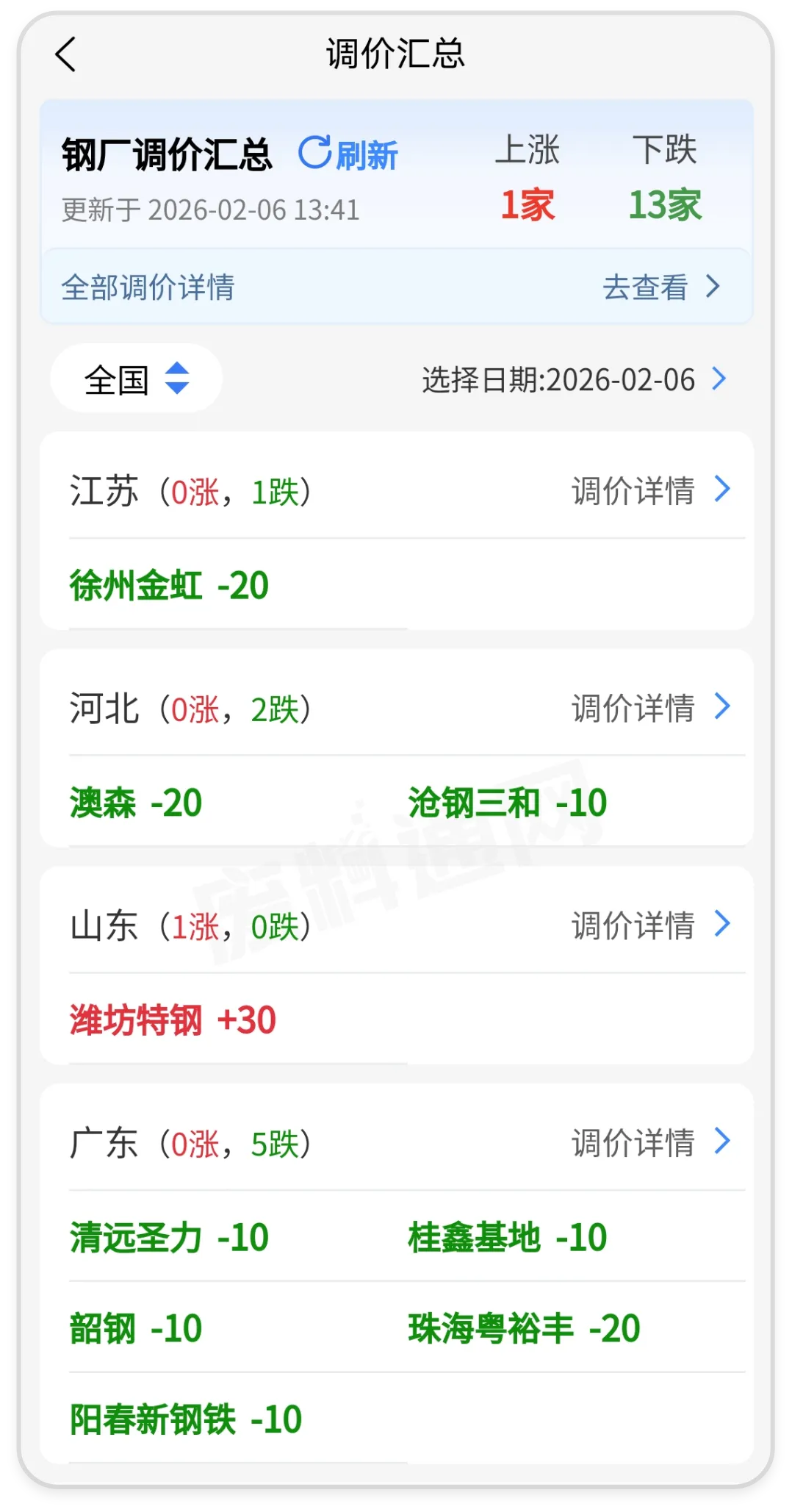 2月6日零时起江苏【徐州金虹】钢铁所有料型价格统一下调20元。最新价:剪切料一级2070,剪切料二级2010,钢刨花一级2100,钢刨花二级2090,数控一级2070,数控二级2060,普通屑一级2030,普通屑二级2020,原厂纯净压块2070,油屑压饼2030,长丝(原厂)2000,不含税2月6日河北【澳森】废钢价格统降20元。执行价:花铁压块一级2300,花铁压块二级2255,钢筋压块2220,重A15厚2330,重A10厚2295,重A6厚2275,重B15厚2305,重B10厚2295,重B6厚22352月6日早上6点开始山东【潍坊特钢】废钢价格涨30元/吨:3%增值税专用发票:重型废钢:2513元/吨,特级废钢:2462元/吨,中级废钢:2390元/吨。13%增值税专用发票:重型废钢:2647元/吨,特级废钢:2593元/吨,中级废钢:2517元/吨。废钢个人户:重型废钢:2448元/吨,特级废钢:2397元/吨,中级废钢:2326元/吨。