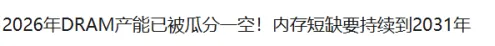 DRAM(内存):2026年Q1合约价环比上涨90%-95%,创历史新高。其中: