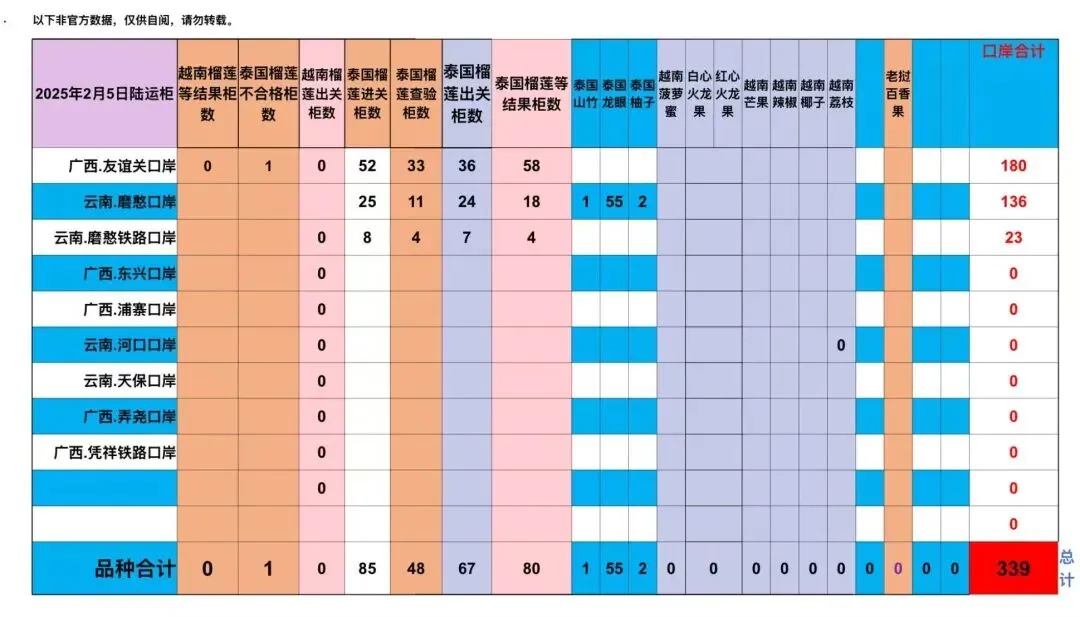 陆运口岸数据越南榴莲总出关数据:37柜。泰国榴莲总出关数据:67柜。