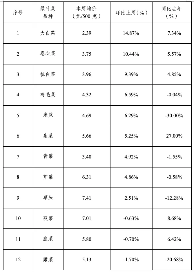 重点品类:12种绿叶菜零售均价为 4.99元/500克,环比上涨3.98%,同比下跌2.95%。具体品种价格变动如下: