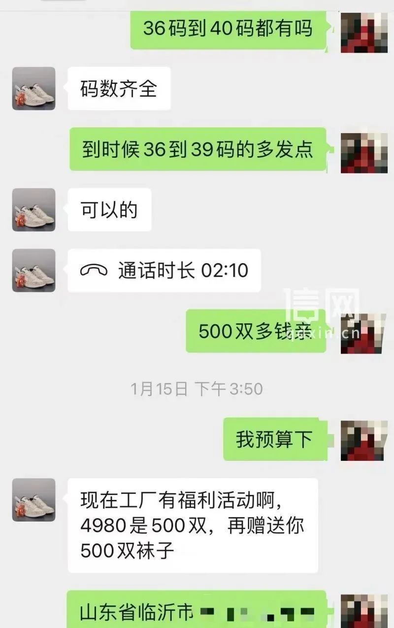 经过几轮沟通,双方约定以4980元的价格成交500双鞋,每双鞋价格不到10元,货品以36~40码的精品女鞋为主。况经理还表示,可以额外送500双袜子,相当于白赚。被“高利润”和“免费赠品”打动,刘女士在1月18日收到对方发来的物流单号后,便通过微信转账付清了4980元。