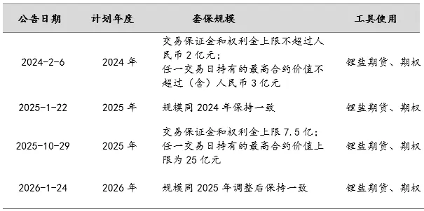 2023年7月,广期所挂牌上市碳酸锂期货品种。与中小规模企业不同,赣锋锂业并未立即发布公告参与碳酸锂套保。而是直到2024年2月,碳酸锂价格下行到10万/吨附近才首次发布公告,开展碳酸锂套期保值业务;而后,2025年、2026年年初发布当年的碳酸锂套期保值计划。
