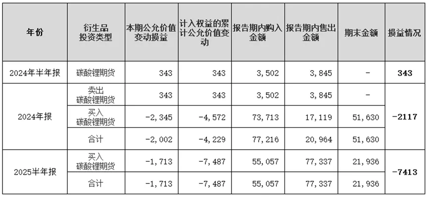 2025年上半年碳酸锂价格持续下跌并且一度跌破6万/吨的关键价位,从赣锋锂业半年报中披露的数据(图4)能够看出,公司坚持多头套保的策略,虽然相较2024年年底的仓位有所下降,但仍然持有2.19亿元的多头仓位,没有改变在碳酸锂价格处于低位时锁定原材料价格的决策方向。