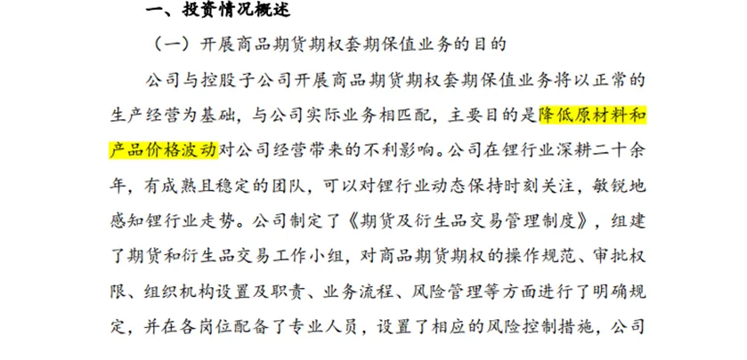 值得注意的是,此次公告与之前不同之处在于,公司开展商品期货期权套保业务的主要目的是“降低原材料和产品价格波动对公司经营带来的不利影响”。而在之前的历次公告中,对主要目的的描述则是“降低含锂原材料价格波动对公司经营带来的不利影响”。