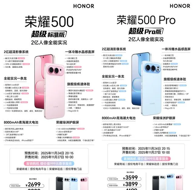 咖啡馆周三下午,人不算多。窗边的桌子上,两个穿西装的中年男人一边刷着手机一边聊着什么,无非是孩子的补习班还是上周的高尔夫球局。可我的注意力全被隔壁桌那个外卖骑手吸引走了。他低头整理着头盔,顺手把自己的手机摆上桌面,是荣耀500,和我手上的Pro版挨在一起。那画面有点微妙:差不多大小的屏幕,颜色也几乎一致。但我目光扫过去,注意到他手指擦过指纹区一小会儿,多试了一下才解锁。我突然还蛮好奇——我们之间那近千元的差价,到底值不值?
