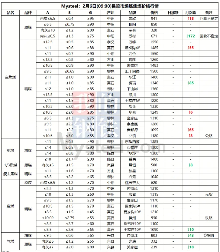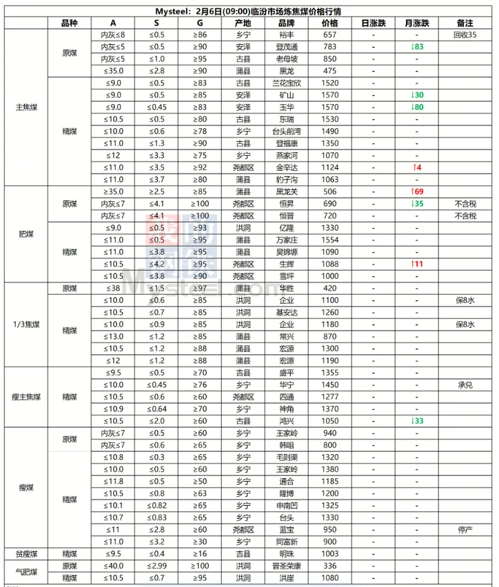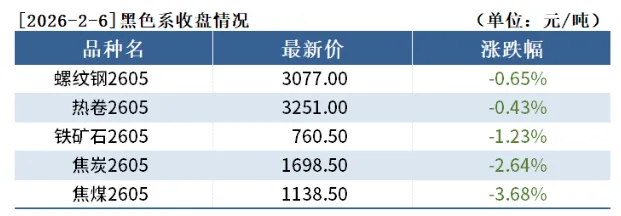 6日吕梁市场炼焦煤价格震荡运行。供应方面,春节临近,产地煤矿将逐步进入放假周期,煤炭供应随之步入阶段性收缩。随着焦钢企业冬储补库进入尾声,市场成交逐步转淡。尽管近期下游采购签单有所减少,但由于煤矿停产在即,焦企仍在积极拉运现有订单库存,带动坑口库存小幅下降。需求方面,目前多数焦企生产节奏总体保持平稳。钢厂方面,由于今年钢材销售整体偏弱,叠加铁水产量增长空间有限,预计后期五大钢材总产量难以显著提升,供给端回升压力不大。随着春节临近,钢材基本面走弱压力或将进一步显现;但短期内受商品共振及宏观情绪支撑,钢价短期内或呈现震荡运行。