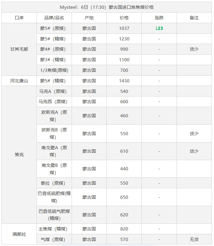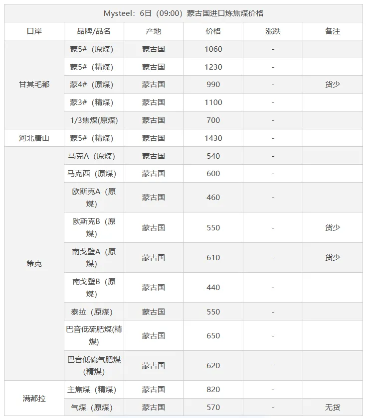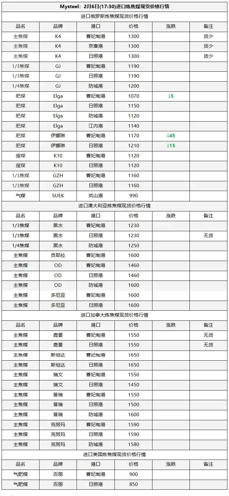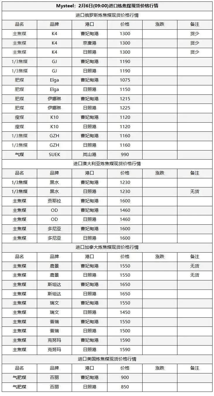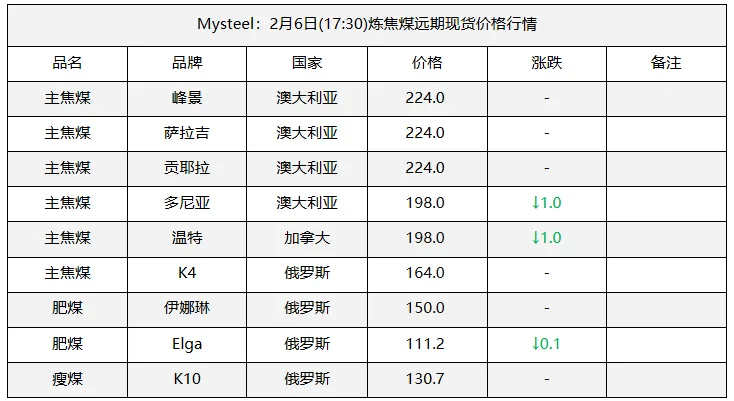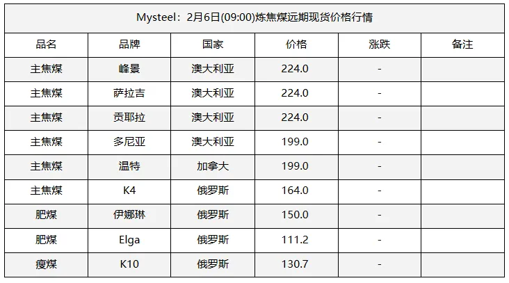 6日进口炼焦煤远期市场暂稳运行。澳大利亚远期海外炼焦煤一线主焦CFR224美金/吨,日环比暂无变化。澳大利亚远期炼焦煤离岸市场受供应有限影响,价格仍旧维持高位水平,市场参与者对后续供应较为担忧。国内市场,买家对远期货物采买意愿一般,多关注现货市场货物。俄罗斯远期炼焦煤市场暂稳运行,个别主流矿山二月货物开始陆续装载,远月货物报价水平处于高位,上下游博弈仍在僵持,贸易商鉴于当前市场尚不明朗,观望情绪较为浓厚。