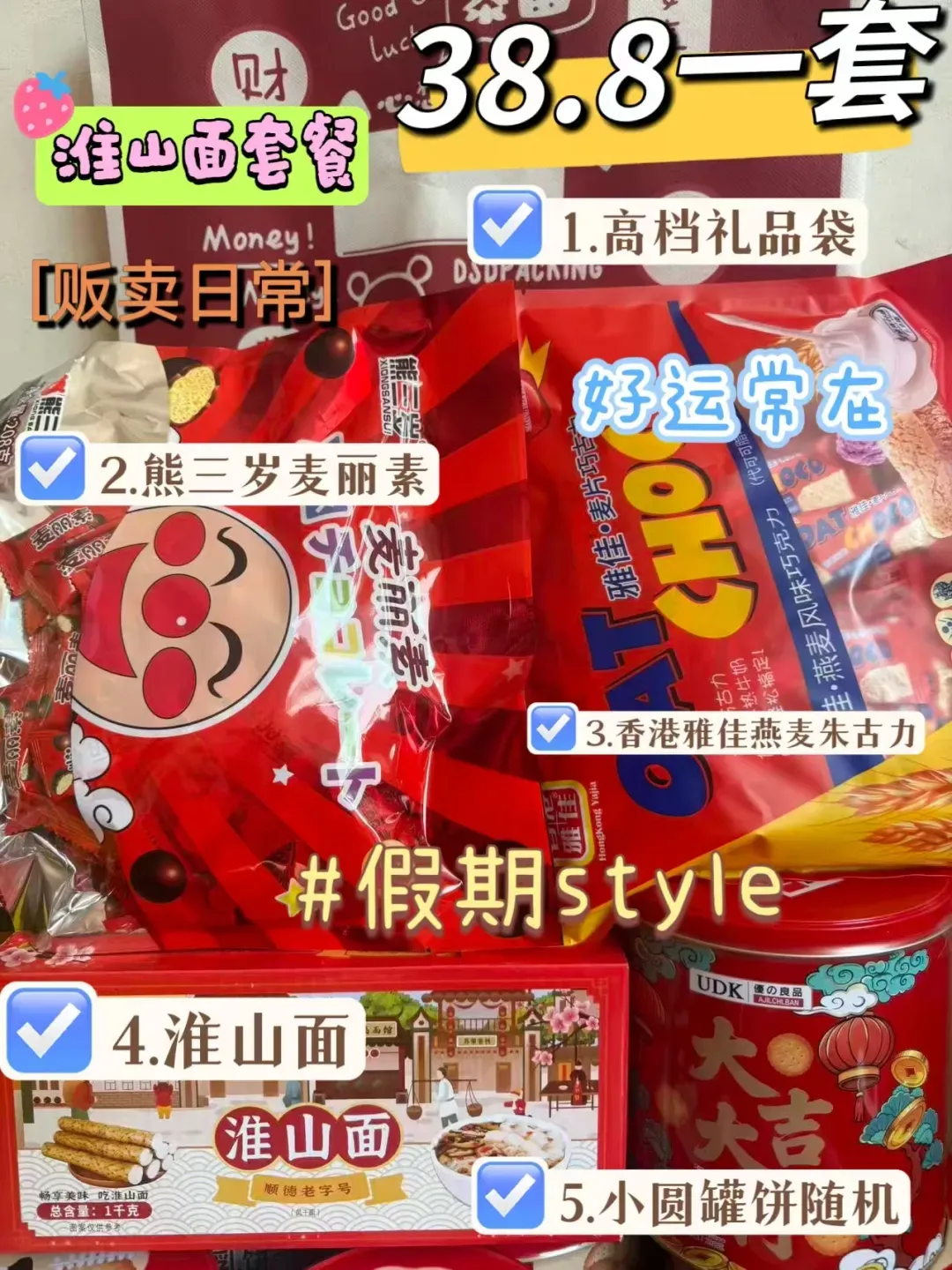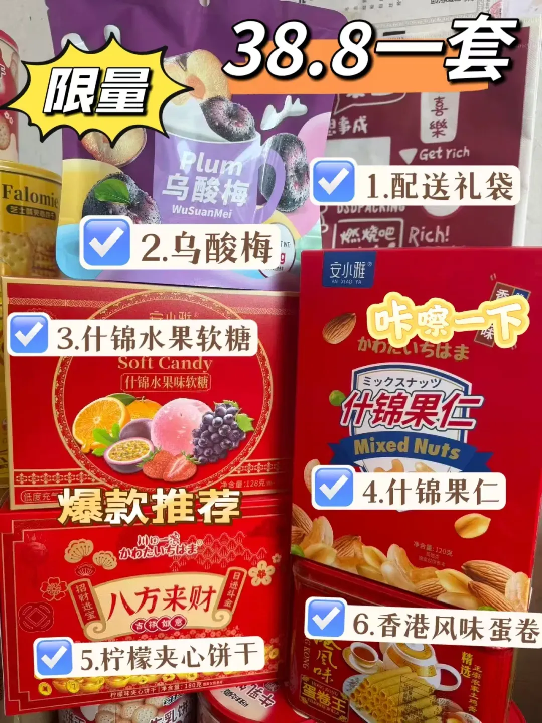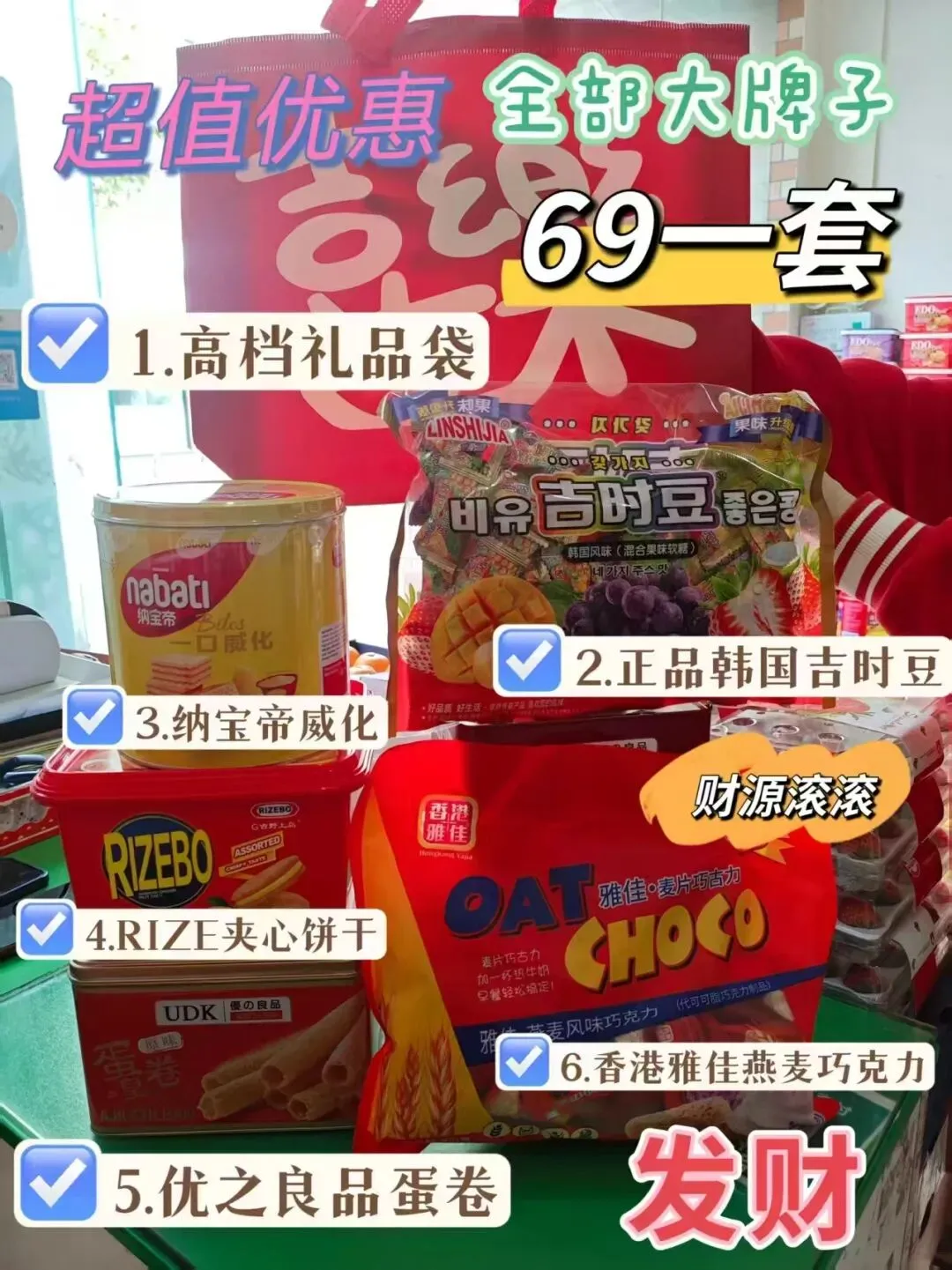 礼品袋+纳宝帝威化+rize夹心饼味道+优之良品蛋卷+吉时豆+燕麦巧克力柠檬夹心饼干+香港风味鸡蛋卷+什锦糖+什锦果仁+乌酸味