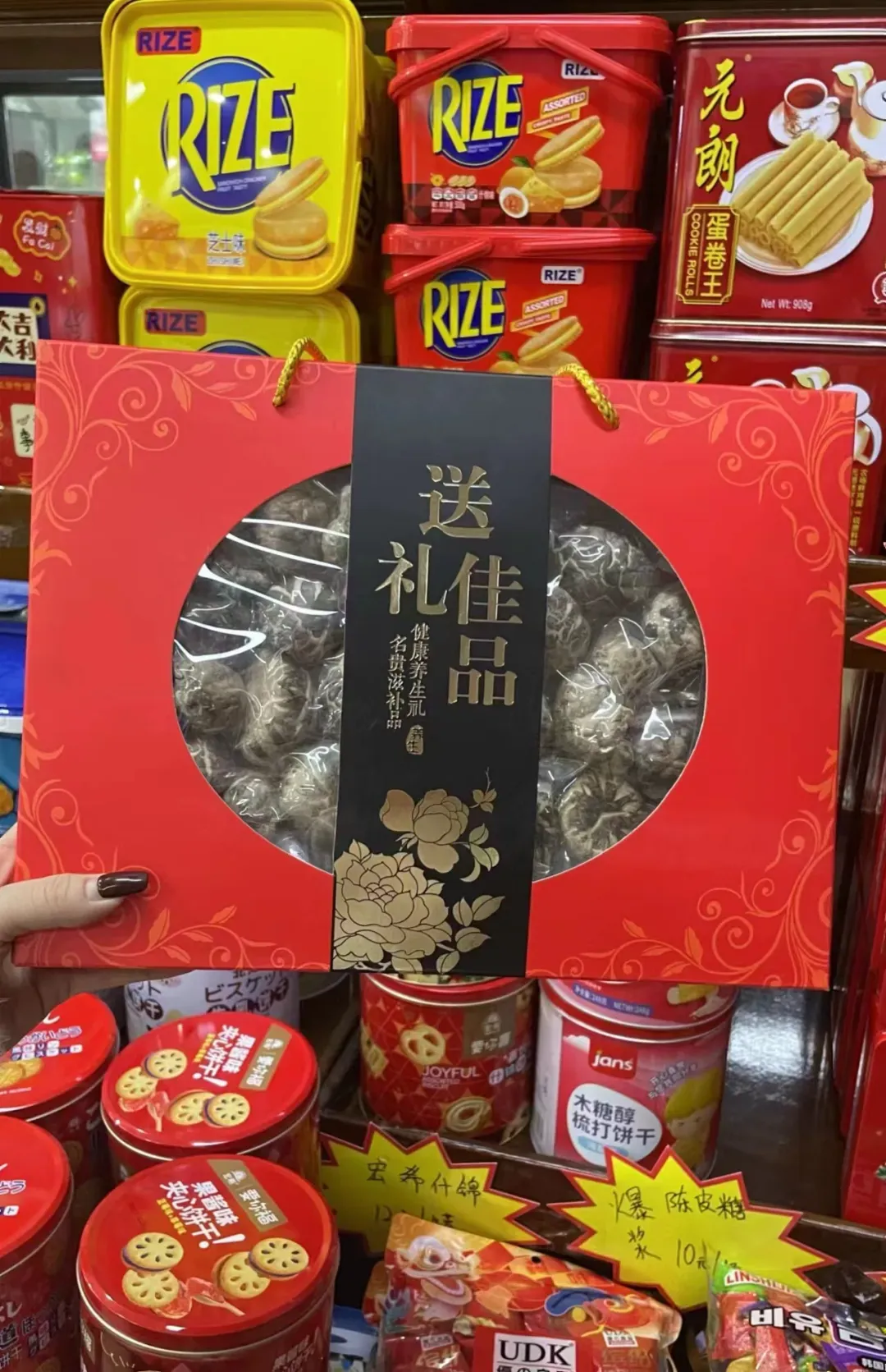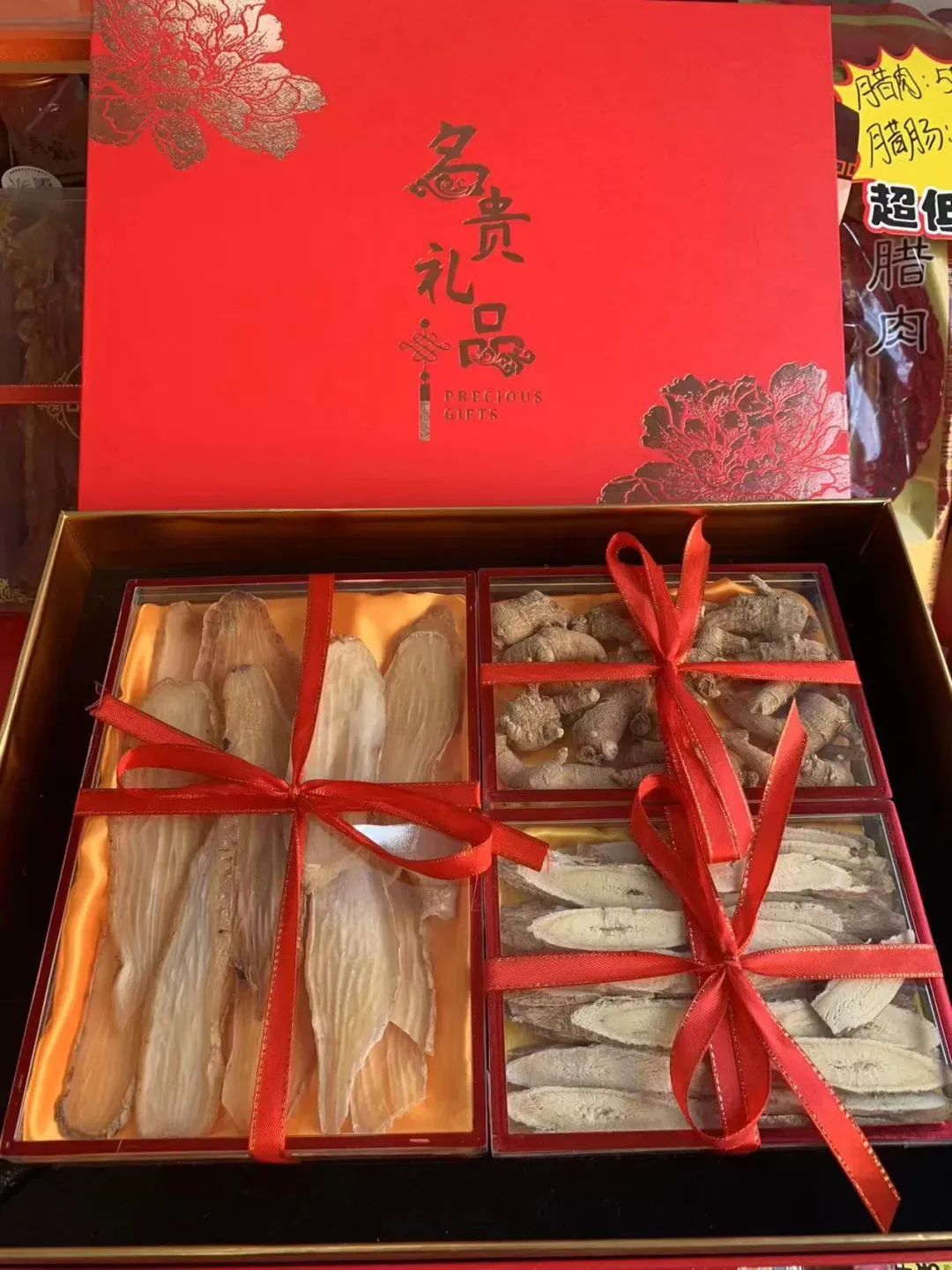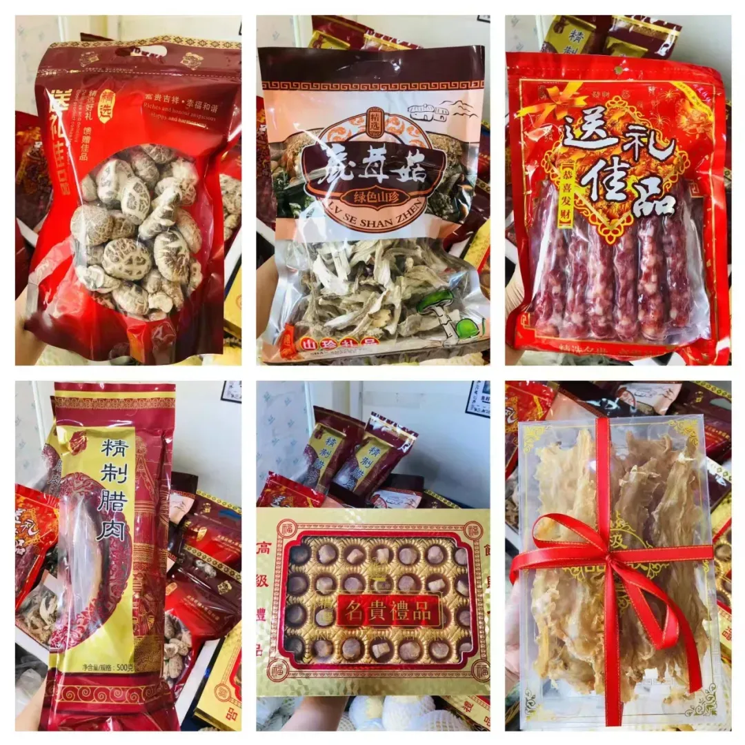 腊肉55元一斤,腊肠500克39元,鹿茸菇180克29元,花菇250克39元,瑶柱礼盒168元,鳕鱼胶礼盒168元