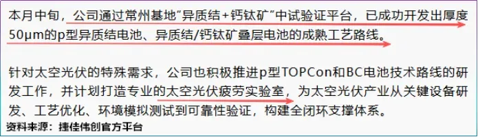 就在1月,捷佳伟创成功开发出厚度50μm的P型异质结电池、异质结/钙钛矿叠层电池工艺路线,借“异质结+钙钛矿”中试平台积极推动太空光伏设备研发。