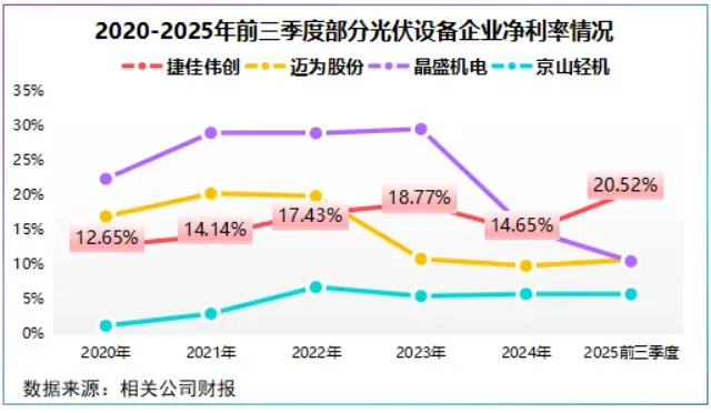 2020-2024年,捷佳伟创年均净利率为15.53%,2025年前三季度达到20.52%,超出迈为股份、晶盛机电10个百分点。