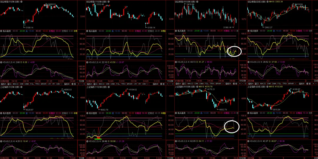 下图上排依次是创业板指的5分钟图、15分钟图、60分钟图、日线图。
