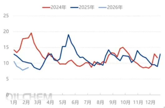 近期来看,涤纶长丝市场业者谨慎心理占据明显上风,对于涤纶长丝现货采购意愿不强。虽下游加弹以及终端织造存在部分工厂适度囤货备料现象,但整体备货力度有限。并且伴随着春节的临近,加弹以及织造负荷已经快速下滑,进入本周后放假力度更是加大,在终端陆续停机,以及业者整体对于后市预期相对谨慎的局面下,大多数终端工厂已经停止采购。下游客户采购谨慎的直接体现在目前国内织造工厂原料(涤纶长丝)库存天数已经处于近几年的低位水平了,截至本周四的数据显示,终端织造企业原料(涤丝)库存平均水平为8.66天左右,相较于2025年和2024年同期均有所下滑。