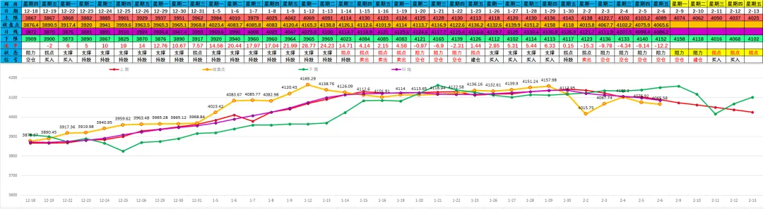 如上图;周线必须突破4096点才能继续走好,2月6日收盘4065.58点,当前由支撑开始进入周线拐点区域,下限最低是3964点;上限持续抬升,从4096点逐步升至4118、4143、4168、4193点。如此,春节前大盘若无法突破4200点,则春节过后周线由支撑逐步转化为阻力持续反压走弱,本周将是春节前的最后一波行情,只有突破4097点,周线波段行情才有望重启。