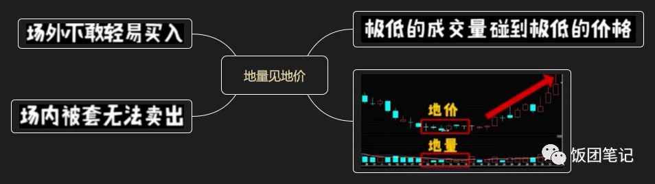 一般来说,当一段行情进入到下跌尾端的时候,那么这会儿的交易会十分的清淡。这是因为经过长时间的下跌——场外投资者信心严重不足,所以不敢轻易入场买入;而还在场内的投资者,基本上都是被套牢,没有赔钱抛出的勇气。如此一来成交量自然就会变得非常的低,形成了我们所谓的一个地量。同样由于场内已经没有人再愿意抛售这个股票(因为都被套了),也就没有下跌的一个动力了,场外也不买了,所以价格也就会跌无可跌,形成了我们讲的地价。