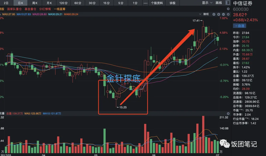 金针探底的下影线越长代表这个底部确定性也就越大。这个逻辑是什么呢?这个在之前K线相关的分享中有介绍,请阅读【四 | 股票入门——剖析股市中避无可避的K线】。