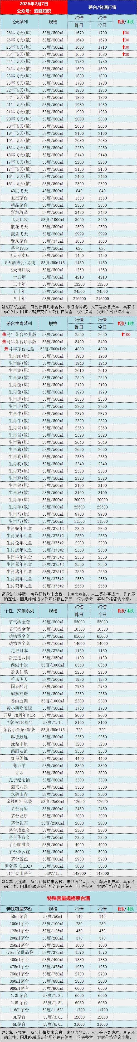 今日茅台酒行情价格参考:飞天系列,2025-2026年飞天原箱、散瓶连续多日上涨;生肖系列,马年经典版大幅上涨。更多茅台系列酒具体行情参考下文图表:《酒趣知识》温馨提醒:商品信息均未含税、未包含物流、人工等必要成本,具有不确定性。因此终端成交价可能存在偏差, 仅供参考,实时价格咨询小编。注意:茅台等品牌老酒价格小幅波动频繁,老酒受品相克重影响价格差异大,同时不同地区价格有几十元不等的差价,最终以实际成交价格为准!《酒趣知识》公众号给您带来茅台酒及时行情参考,同步深挖茅台、五粮液、汾酒等各大名酒资讯,为酒友奉上客观的价格参考与专业的行业解读,让大家用酒有价可依、避坑无忧。丨声明:部分图文来源于网络,版权归原作者所有,如涉及版权等问题,请及时与小编联系删除或修改。