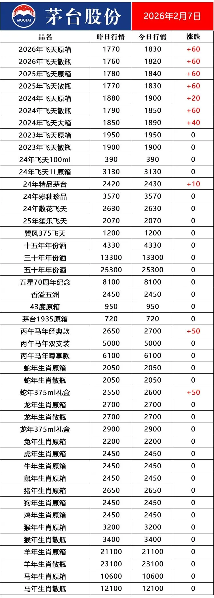 2月7日茅台酒行情:飞天与马茅经典版涨势显著