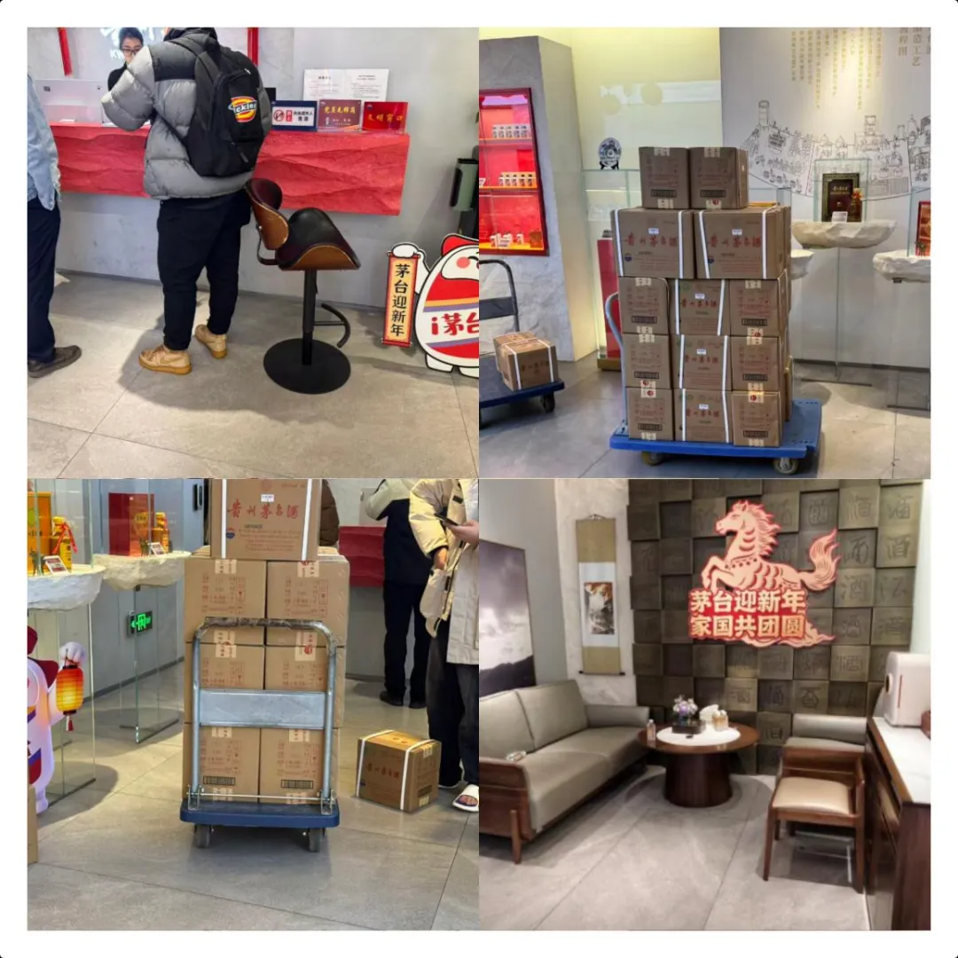 笔者在现场看到,店里有几十箱各类茅台产品刚刚到货,几乎摆满了过道,等待顾客提货或送货上门。笔者在前台仅仅观察十分钟左右,就有十几名顾客进店提货。