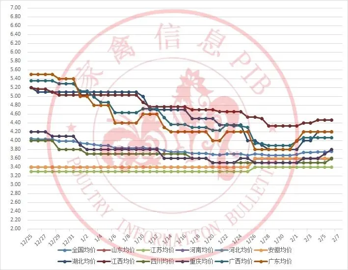 2025年12月25日-2026年2月7日主流地区白羽鸭毛鸭均价走势图