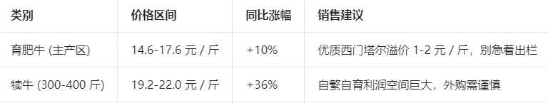 目前主产区育肥牛价格在14.6-17.6元/斤,同比涨了10%,而且有个明显特点——优质品种和普通品种,价格差能达到1-2元/斤,其中西门塔尔牛的溢价最突出。