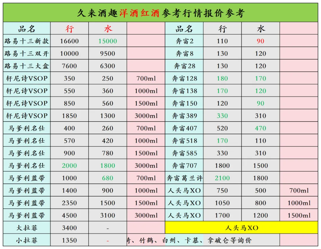 洋酒红酒包含品类:路易十三、奔富、拉菲、轩尼诗等!养生品涵盖虫草、燕窝、安宫等行情参考如有补充请及时联系我们: