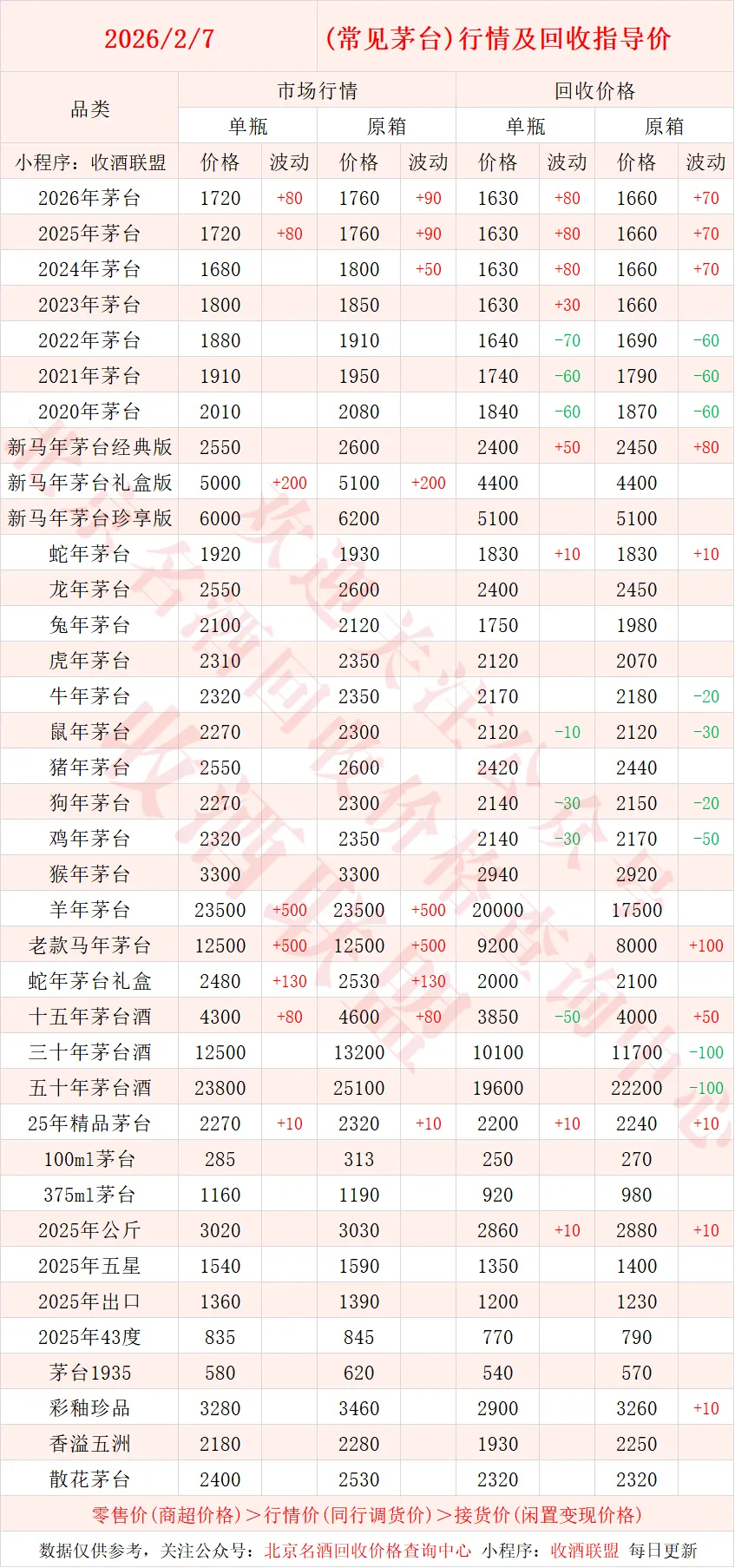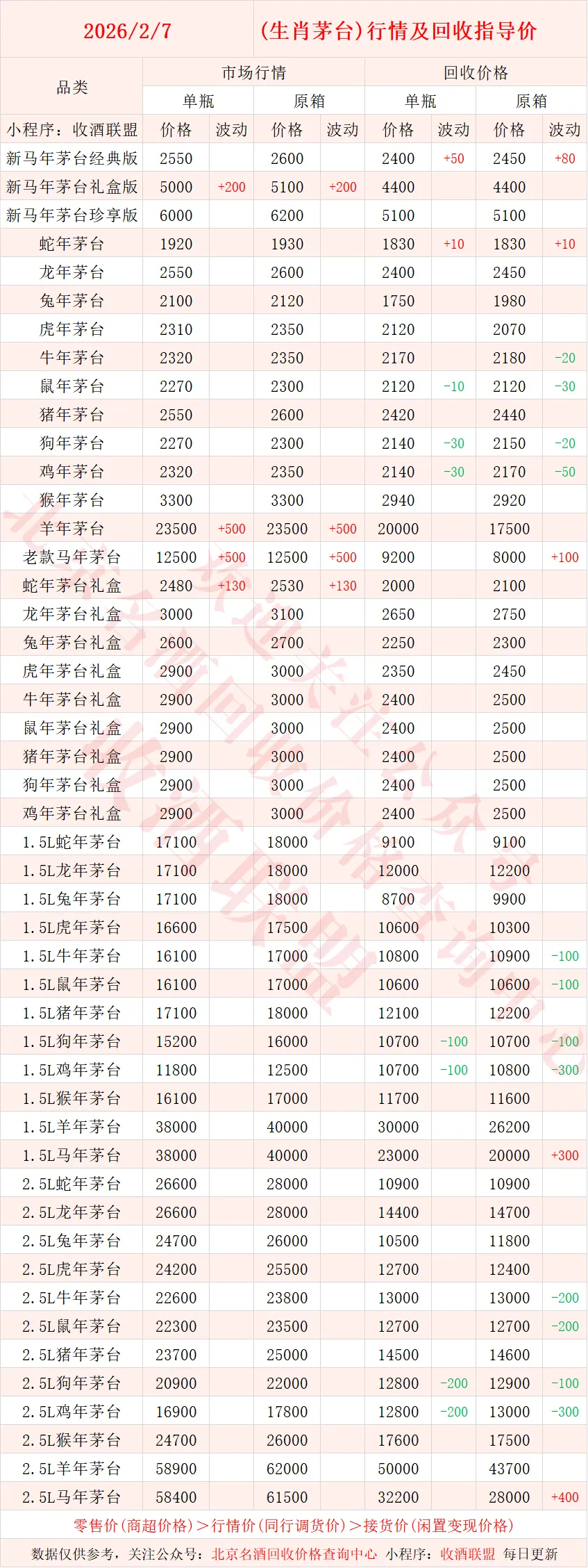 以下内容为,本公众号每日会及时更新的飞天茅台、生肖茅台、年份茅台,陈年茅台及不同毫升容量茅台的市场行情和回收报价;还包含五粮液、汾酒、剑南春、泸州老窖等国产名酒的行情及回收价,法国拉菲、木桐、玛歌等名庄红酒的回收报价,轩尼诗、马爹利、人头马等世界知名洋酒威士忌的回收参考价,每日整理不易,请点击关注支持。▪畅销类茅台行情及接货参考价▪