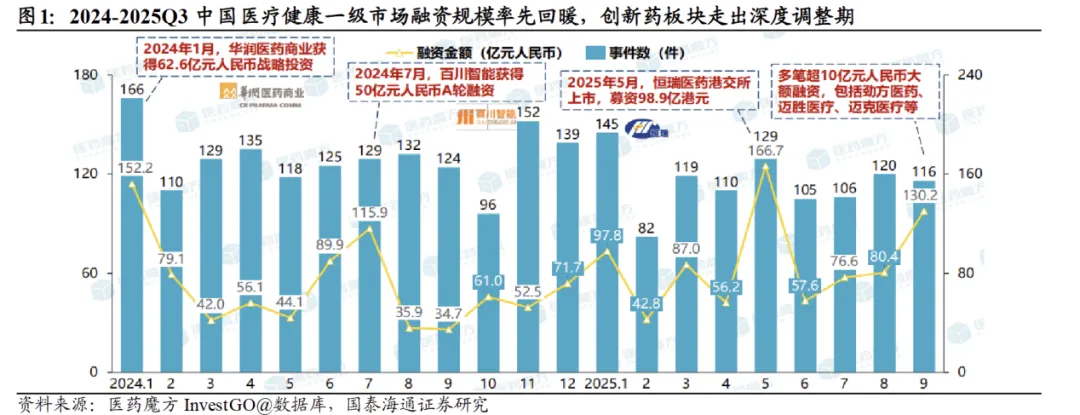 2025年Q1-Q3医疗健康一级市场融资金额达795.3亿元,同比增长22.4%,尽管融资事件数略有下降,但呈现“资金先回暖、项目后跟进”的底部反转特征。