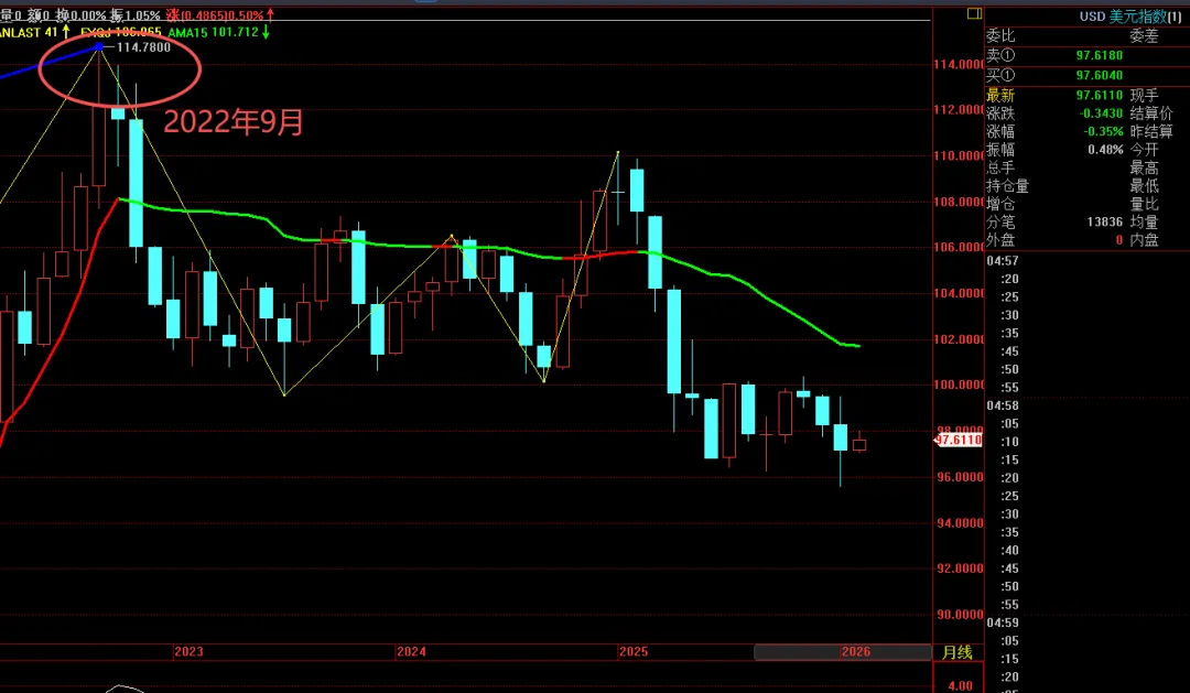 风险提示:最近金银波动较大,期货交易是有杠杆属性的,节奏不对就会多空通杀,不要盲目冲动重仓交易,等待波动率下降后的新一轮交易机会。各位参与贵金属交易的始终要明白本轮始于2022年的金银多头行情的底层逻辑只有一个,那就是美元,打开美元指数和贵金属的月线图做个对照就明白了。2022年9月美元指数见高点114.78,2022年9月美白银见月线低点17.4。此后每一次美元下跌就是金银大涨之时,而每一次美元反抽就是金银震荡调整之时,而最近的行情更是将这个情况演绎到了极致。最近的贵金属一轮猛冲加一轮猛跌,对应的就是美元一轮猛跌加一轮反抽,美元的振幅来看其实也没多么剧烈,但参与贵金属交易的资金早已波涛汹涌,按捺不住抢跑的心。但短线高胀的情绪加天量的获利盘,只要碰到一点“强势美元”的风声,就会造成获利盘的汹涌而出直至造成踩踏,尤以高波动出名的白银为甚,几天时间高位下来都快腰斩了。但“强势美元”的口号也仅仅只是口号而已,可能制造短期的波动,无法改变长期的趋势,如果喊了口号就能做到,那美国现在也不至于如此割裂了,有些东西是不以人的意志为转移的,强撑最终也不过是个精尽人亡的结果。美元指数月线级别的下跌也只是刚刚起步而已,终极目标破2008年次贷危机低点去往70甚至更低是可以看得到的。短线日线一笔反弹结构上也是合理的,日线二卖一笔下杀,本来就有结构上反抽的需求,反抽做日线类二卖,我们多么熟悉的结构。这个日线反抽结束,或许就迎来美元指数月线级别阴跌的开始了,那金银新一轮多头行情也就在路上了。交易上我更喜欢看白银,因为白银的走势更符合自然规律,黄金的买盘太大,导致每一次调整总是不尽如人意,调整结构不饱满,黄金更适合长线配置,短线交易则是白银更合适,只是当下波动率太高,也不太适合一般人就是了,看这次调整能否将波动率打下来。短线结构而言,美白银120分钟已经下上下三笔,日线也已经破了下60MA,空间上而言差不多了,但是如果能搞个类二卖出来然后再破个新低,结构上会更饱满些,而且黄金日线还没破新低,那就不够日线一笔调整,最好就是这里弹一弹,然后搞个新低完成最终的调整。算算时间,春节前也没啥好看的了,所以这里不需要去纠结最终是以哪种模式完成调整,春节后自然会见分晓。总而言之,贵金属的多头行情不是结束,而是新的开始。黄金偏配置型,也就是不要带杠杆去配,哪怕挨套也只是时间问题,白银偏交易属性,重要的是采准节奏。最后再强调一些交易风险,高波动资产,别重仓死扛,否则就算看对了也无济于事。这一轮白银,有人从60美元就开始一路做空了,尽管最近很多空头在欢呼雀跃,但这一路上已经埋葬了不知道多少皑皑白骨,活下来的只不过是一小部分幸运儿而已。