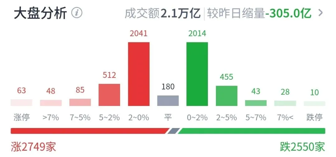 跌0.25%,深成指跌0.33%,创业板指跌0.73%。沪深两市成交额2.15万亿,较上一个交易日缩量305亿。