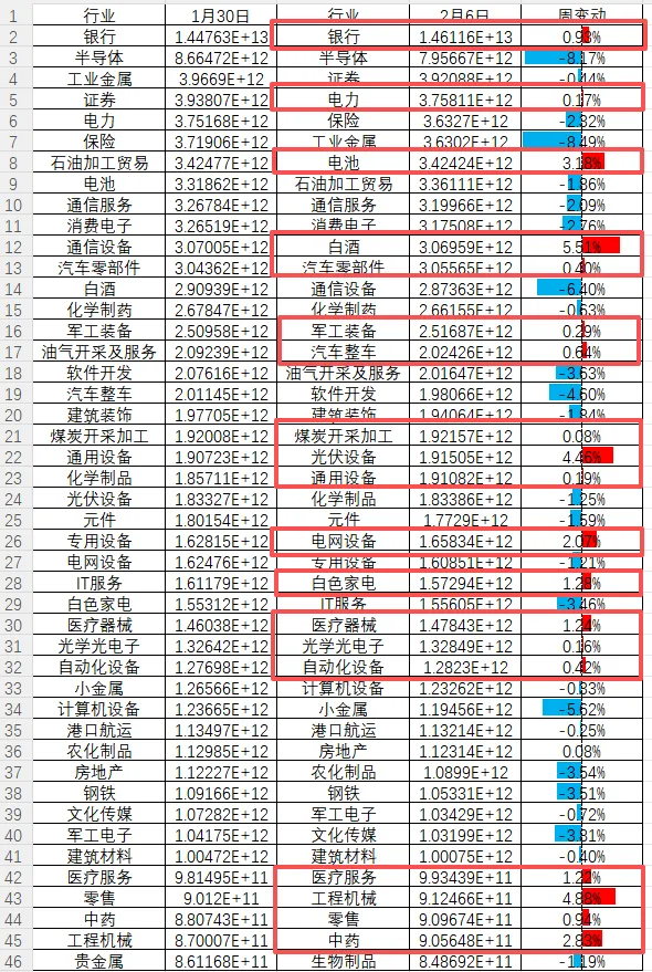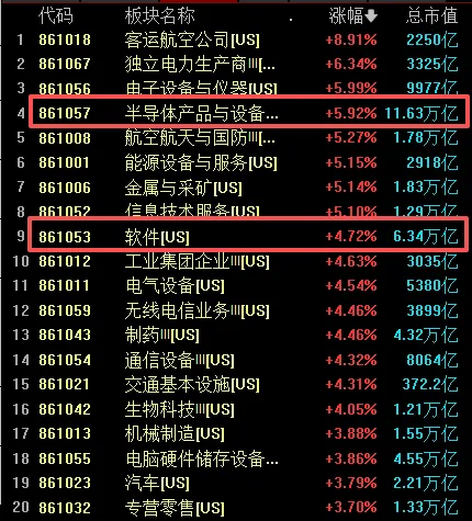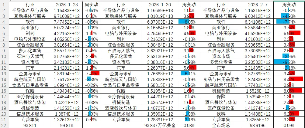 半导体板块回调后周五已经大幅度的反弹,周变动幅度并不明显;航空航天、金属与采矿也都反弹了;包括周跌幅达到-7.74%的软件也在周五夜盘出现4.72%的板块涨幅,主要