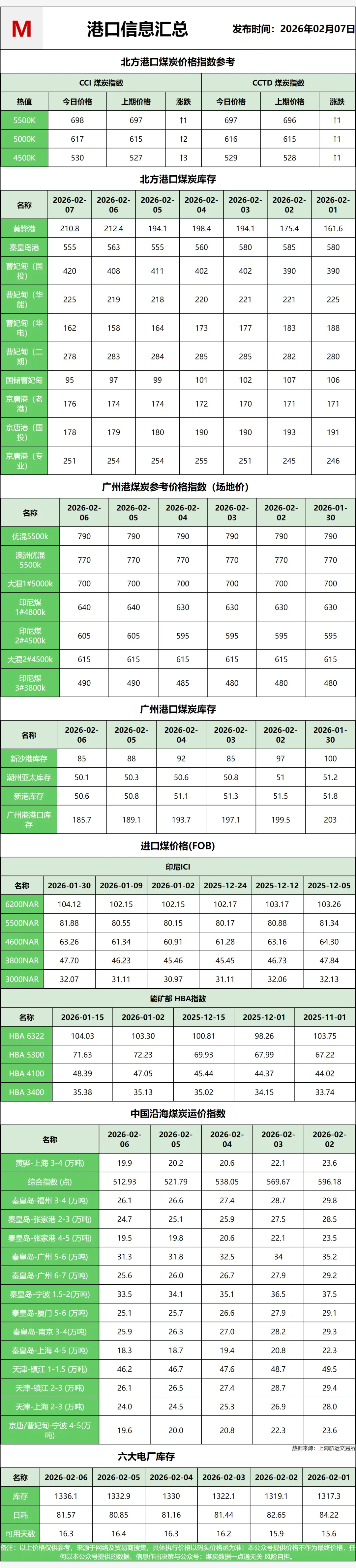 【产地情况】:煤炭行情有点分化,整体还是偏弱势但有零星小涨。山西、陕西、内蒙这些主产区,大部分煤矿都响应就地过年号召没放假,正常产煤,但下游买涨不买跌的情绪特别浓,都是按需少量采购,煤矿就算大幅降价,销量也没怎么起来。而且现在司机提前放假过年,公路、铁路运力都比较紧张,煤矿站台的库存越积越多。不过也有例外,比如内蒙金鸡滩煤矿,今天中午12点起,混煤、精煤、块煤都上调了10元/吨,混煤卖到540元/吨,精煤640元/吨;甘肃平凉崇信县的五举煤矿,6000卡低硫精煤反而下调25元/吨,现汇含税价565元/吨,整体就是涨跌互现但大趋势偏淡。