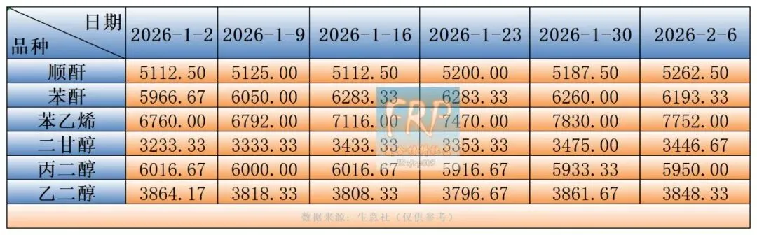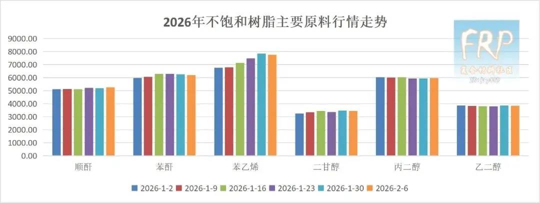 本周UPR主要原材料基准价环比上周,看似涨跌互现,实则呈现颓势。除了顺酐上涨1.45%,其余原料均有所回调,苯酐下调1.07%。